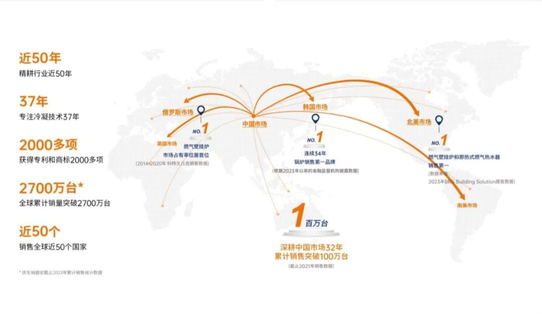 慶東納碧安連續(xù)多年穩(wěn)居韓國壁掛爐市場銷量第一,并積極推動韓國冷凝技術(shù)普及政策。目前,產(chǎn)品已出口近50個(gè)國家和地區(qū)。2023年,在北美市場,慶東納碧安的燃?xì)獗趻鞝t和即熱式燃?xì)鉄崴魇袌稣加新实谝弧F渲?,冷凝即熱式燃?xì)鉄崴魇袌龇蓊~高達(dá)50%,采暖熱水兩用燃?xì)獗趻鞝t的市場份額也達(dá)到了45%。 從1951年的茂山煤炭,到今天的全球綠色能源領(lǐng)軍者,慶東納碧安始終以“技術(shù)變革滿足生活需求”為信念,從替代木柴的燃煤爐,到全球領(lǐng)先的冷凝技術(shù),再到覆蓋家庭與城市的全場景能源方案,慶東納碧安始終以節(jié)能環(huán)保技術(shù),推動舒適生活與可持續(xù)發(fā)展并行。