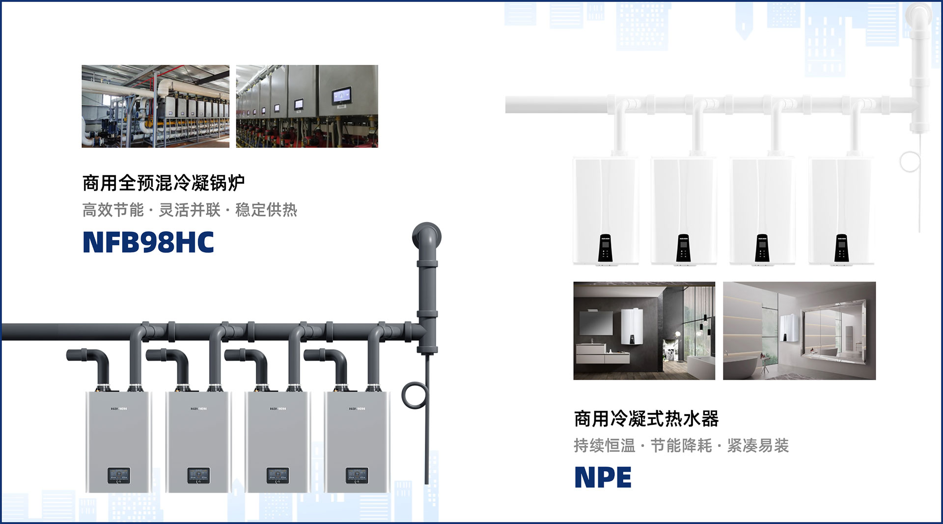 商用市場方面,NFB 98HC冷凝壁掛爐和NPE冷凝式熱水器廣泛應(yīng)用于公共建筑與綜合體。