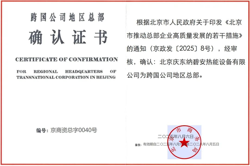 此次認(rèn)證嚴(yán)格依據(jù)《北京市人民政府關(guān)于印發(fā)〈北京市推動(dòng)總部企業(yè)高質(zhì)量發(fā)展的若干措施〉的通知》(京政發(fā)〔2025〕8號(hào))相關(guān)規(guī)定,由北京市商務(wù)局權(quán)威頒發(fā)。它不僅是對(duì)慶東納碧安在京運(yùn)營(yíng)規(guī)模、經(jīng)濟(jì)貢獻(xiàn)及戰(zhàn)略地位的高度認(rèn)可,更是公司全球化發(fā)展征程上的又一重要里程碑。